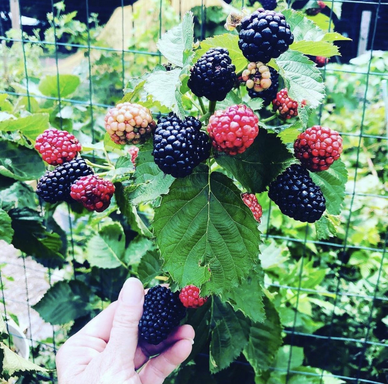 This is Prime Ark Freedom! Developed by the University of Arkansas. It grows like a weed here in Zone 8a. It thrives on neglect. It doesn’t really care what type of soil it’s in. It laughs at our hot dry summers (me, not so much). It’s a thornless hybrid that puts out tons of the biggest juiciest blackberries I’ve ever tasted. I planted two 6-inch bare root canes several years ago. Within a years time, I was picking a gallon of berries. Now we get 4-6 gallons from our 6×10 patch every year. So, stop what you’re doing right now and order yourself some! You’ll be thanking me next year at this time.
